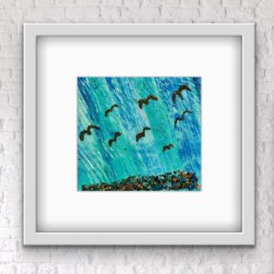 This painting “Tranquil Blues” captures the essence of a serene sky filled with vibrant blues and silvery iridescent lines, evoking the feeling of a perfect sunny day. The eight birds soaring gracefully across the canvas symbolize freedom, unity, and the diverse journeys of individuals in our communities. Their flight represents the aspirations and dreams of people from all walks of life, each contributing they’re unique perspectives to the collective experience.